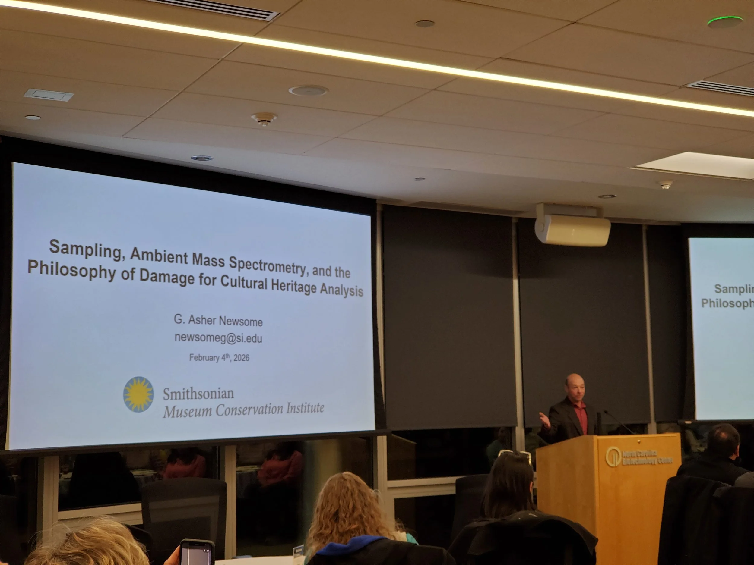 Material analysis is needed to support all manner of research at the Smithsonian, although it may be more important to the museum and other interested parties that rare, precious, or culturally sensitive objects remain un-damaged. Mass spectrometry in its various forms presents a powerful tool, but it is inescapably destructive at some level. As the sensitivity of modern instrumentation grows, the sample mass that must be collected and ionized shrinks, perhaps to the point where it becomes debatable whether the amount removed constitutes “damage”. Ambient mass spectrometry methods offer particular opportunities for sensitive object analysis because they can theoretically be performed without cutting material from a whole or preparing the surface. I will present several recent projects that pertain to different forms of minimally-invasive, ambient sampling from materials such as wood, parchment, textiles, ceramics, plastics, and others. I will also show recently-developed instrumentation methods that accommodate intact objects too large to fit immediately adjacent to the mass spectrometer.